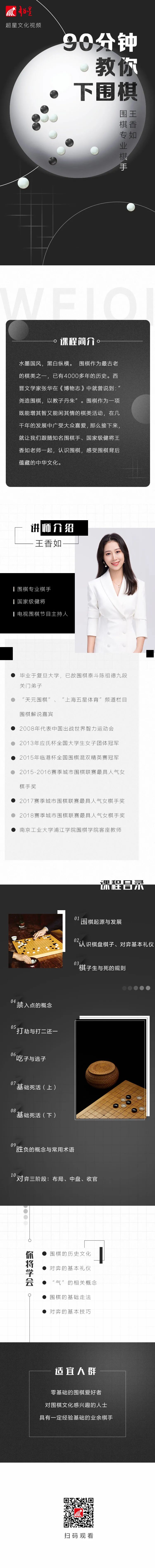 围棋是我国最古老的棋类之一 上溯尧舜,流传至今 已有4000多年的历史 它不似古琴 奏高山流水、琴瑟和鸣之声 亦不若书画 写翰墨丹青、活色生香之意 但棋盘之上 有棋逢对手、玄机重重之趣 玉子纹楸,黑白分明 品茗对弈,自在迂回 围棋位列“文人四艺”之一 自有其独特的魅力 其实 习练围棋,既能增加智慧,又能陶冶情操 是一项老少咸宜、身心俱益的娱乐活动 为帮助大家更全面地认识围棋 掌握围棋入门的基本知识 超星文化视频 特邀知名围棋手、国家级健将王香如老师 策划本期《90分钟教你下围棋》课程 让你轻松入门,深入体会棋道中的文化底蕴 快来扫码体验吧~