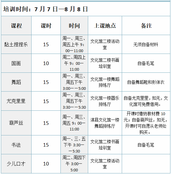 葫芦丝 课程时间 周一、周三、周五9:00—11:00 适合年龄 8-16周岁 教学地点、人数 淇县文化馆一楼舞蹈排练厅 培训名额:20人 备注 开课时缴纳教材费10元;自备葫芦丝,如无,开课时可自愿从老师处购买。 师资简介 书法 课程时间 周一、三、五下午3:30——5:30 适合年龄 8-16周岁 教学地点、人数 文化馆二楼书画培训室 培训名额:20人 备注 自备毛笔 师资简介 少儿口才 课程时间 周二、周四下午3:00—5:00 适合年龄 8-16周岁 教学地点、人数 文化馆二楼活动室 培训名额:20人 师资简介 策划:侯 亮 审核:李志勇 编辑:闫思涵